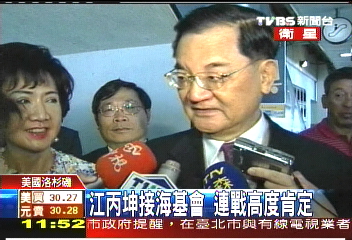 據(jù)臺灣TVBS 報道,受邀到美國大學(xué)演講的國民黨榮譽主席連戰(zhàn)及其夫人連方瑀,在洛杉磯過境轉(zhuǎn)機。連戰(zhàn)聽到國民黨副主席江丙坤將要接掌海基會的消息,給予高度的肯定:“好極了!非常好!”