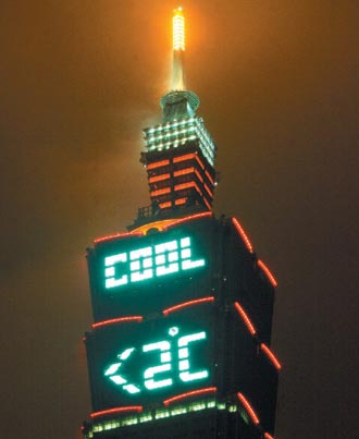 臺(tái)北101大樓從昨晚起連續(xù)7天晚間,會(huì)在頂端點(diǎn)亮起“<2℃”與“COOL”字樣,提醒民眾“為地球降溫”,不能讓地球再增溫超過攝氏2度。臺(tái)灣《聯(lián)合報(bào)》記者林俊良攝