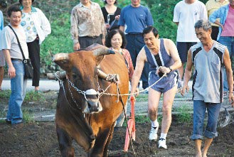 馬英九(前右二)曾在下鄉(xiāng)時(shí)向農(nóng)夫許支主(前右)學(xué)犁田,馬希望各“部會(huì)首長(zhǎng)”以后也要下鄉(xiāng)長(zhǎng)住。臺(tái)灣《聯(lián)合報(bào)》資料照片 范凌嘉攝