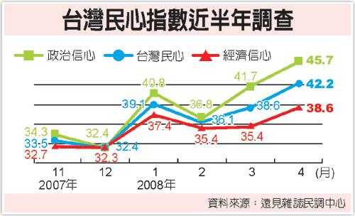 據(jù)臺(tái)灣《經(jīng)濟(jì)日?qǐng)?bào)》報(bào)道,由臺(tái)灣《經(jīng)濟(jì)日?qǐng)?bào)》與《遠(yuǎn)見(jiàn)雜志》合辦的“臺(tái)灣民心指數(shù)”調(diào)查發(fā)現(xiàn),馬英九、蕭萬(wàn)長(zhǎng)在3月份臺(tái)灣地區(qū)領(lǐng)導(dǎo)人選舉中取得壓倒性勝利,島內(nèi)民心指數(shù)也呈現(xiàn)上揚(yáng)的走勢(shì),4月份達(dá)42.2點(diǎn),但仍在“有失民心”的階段。不過(guò),在馬英九陸續(xù)釋出開(kāi)放大陸游客、兩岸包機(jī)等“利多”信息下,島內(nèi)民眾對(duì)未來(lái)臺(tái)灣政治穩(wěn)定度與兩岸關(guān)系的改善存有相當(dāng)高的期待。