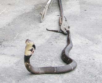 前天消防局宜蘭分隊(duì)抓蛇時(shí),林碧云先買青蛙誘蛇出來(lái),消防隊(duì)員趕緊用捕蛇夾挾住,眼鏡蛇昂首吐信,模樣嚇人,隊(duì)員當(dāng)晚即將其放生。