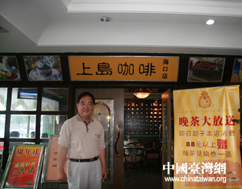 中國臺灣網(wǎng)5月20日消息 對“上島咖啡店”董事長江裕昌先生的采訪,約在坐落于?谑袃(nèi)的大陸首家上島咖啡店鋪里。一進門,記者就被大廳內(nèi)掛著的“上島咖啡被海南省餐飲協(xié)會評為首選十佳時尚咖啡第一名”的橫幅所吸引。江董很早就坐在包間等著,見到我們的第一句話:“先什么都不用說,嘗嘗我們這的咖啡和牛排后再談不遲!彼查g,記者感到與這位儒商的距離被拉近許多。