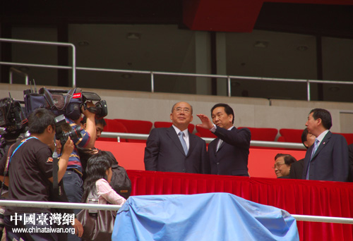 吳伯雄一行先是在觀禮臺(tái)上環(huán)視了體育場內(nèi)的全貌,而后緩步通過觀眾通道走到等候在現(xiàn)場的記者面前,與記者親切互動(dòng)。