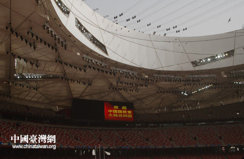 在吳伯雄一行到來之前,體育場觀眾席上方的大屏幕就早早地打出了“歡迎中國國民黨大陸訪問團(tuán)”的醒目標(biāo)語,熱切期待著這位來自寶島的客人。