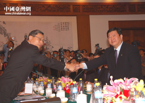今天上午,海協(xié)會與;鶗蛢砂吨苣┌鼨C議題進行協(xié)商。這是海協(xié)會執(zhí)行副會長孫亞夫與海基會副董事長兼秘書長高孔廉在協(xié)商前握手。(攝影:中國臺灣網(wǎng) 田云鵬)