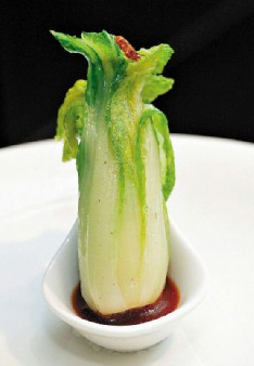 像是游客必看的翠玉白菜,斜倚在小碟子里,主廚蕭廣安選產(chǎn)自臺(tái)灣中部的娃娃菜,整棵菜剝掉90%,只取中心葉菜層、長(zhǎng)約8到10公分大小。先經(jīng)過火腿、雞高湯汆燙入味,之后可以淋上XO高湯醬汁熱食、或搭配咸甜的芝麻醬汁當(dāng)開胃冷食,主廚更以櫻花蝦替代螽斯和蝗蟲,食趣十足。