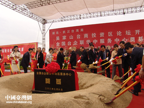 中國臺灣網(wǎng)7月6日武漢消息 今日下午,全國臺灣同胞投資企業(yè)聯(lián)誼會華中地區(qū)服務(wù)中心在武漢市東西湖區(qū)吳家山臺商投資區(qū)奠基。臺企聯(lián)會長張漢文表示,“希望服務(wù)中心能成為臺企未來發(fā)展的大方向,為臺商打造一個更有發(fā)展的舞臺!敝袊鴩顸h副主席關(guān)中、臺企聯(lián)會長張漢文、臺企聯(lián)秘書長何世忠、國臺辦經(jīng)濟局副局長王征等領(lǐng)導(dǎo)及嘉賓出席了奠基儀式。