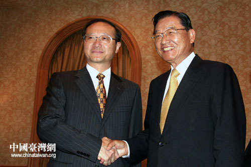 江丙坤10日在此間會(huì)見(jiàn)了大陸居民赴臺(tái)旅游首發(fā)交流考察團(tuán)團(tuán)長(zhǎng)、海峽兩岸旅游交流協(xié)會(huì)會(huì)長(zhǎng)邵琪偉一行。