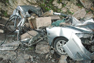 傷勢最輕的謝曜澤說,事發(fā)時,因山區(qū)一片漆黑,根本無法預(yù)警,行經(jīng)事故地點,只聽到一聲轟然巨響,車身一陣劇烈搖晃,接著感覺石頭就像雨點霹哩啪啦的落在車上,有3顆大石頭打到車頂,瞬間壓扁車子,其中最大的一顆直接砸在他身旁女同事楊千儀頭上。