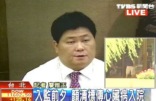 臺北榮總醫(yī)院表示,顏清標在昨天晚上11點時,因為胸口不適和氣喘而送急診,經(jīng)過檢查之后,發(fā)現(xiàn)是急性心衰竭,在做過診療之后,已經(jīng)轉(zhuǎn)到加護病房。