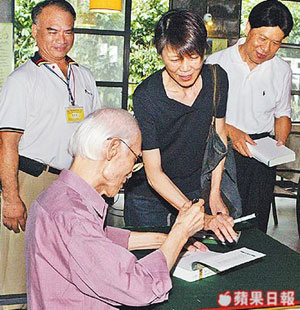 周美青(中)昨以“周同學”身份聽余光中(坐者)演講并請余簽名。臺灣《蘋果日報》圖