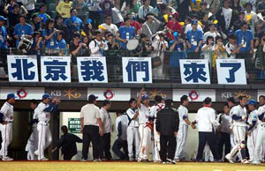 資料圖:(左)3月12日,中華臺北棒球隊以5比0力克澳大利亞,球迷打出“北京,我們來了!”的字幅。(右)8月6日,中華臺北奧運代表團在北京奧運村舉行升旗儀式。