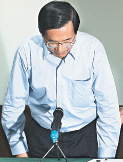 陳水扁卸任后首次舉行記者會,坦承短報選舉剩余款,這些錢由其妻吳淑珍在他不知情下匯往島外賬戶,他照著文字稿念完,隨即鞠躬離開,留下一堆謎團。臺灣《聯(lián)合報》圖