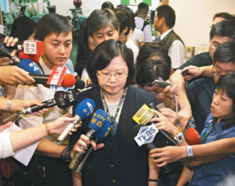 民進黨昨天舉行臨時中常會,面對媒體追問陳水扁爆發(fā)洗錢丑聞事,民進黨主席蔡英文(中)面色凝重。臺灣《聯(lián)合報》圖