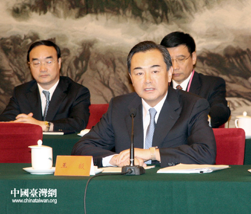 2008年臺(tái)商座談會(huì)28日上午在北京人民大會(huì)堂舉行。國(guó)務(wù)院副總理王岐山和國(guó)務(wù)院20多個(gè)主要部門負(fù)責(zé)人及60多位臺(tái)灣工商界人士、大陸臺(tái)商代表參加座談。圖為中共中央臺(tái)辦、國(guó)務(wù)院臺(tái)辦主任王毅在主持座談。(中國(guó)臺(tái)灣網(wǎng) 田云鵬 攝)