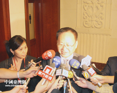 2008年臺商座談會28日上午在北京人民大會堂舉行。國務(wù)院副總理王岐山和國務(wù)院20多個主要部門負(fù)責(zé)人及60多位臺灣工商界人士、大陸臺商代表參加座談。圖為全國臺灣同胞投資企業(yè)聯(lián)誼會會長張漢文在會場外接受媒體采訪。(中國臺灣網(wǎng) 田云鵬 攝)