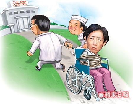 公務(wù)機(jī)要費(fèi)案本周五將再度開庭,法院請(qǐng)求醫(yī)院支持吳淑珍到庭所需的醫(yī)療設(shè)備及醫(yī)護(hù)人員,以備不時(shí)之需。圖為臺(tái)灣《蘋果日?qǐng)?bào)》漫畫