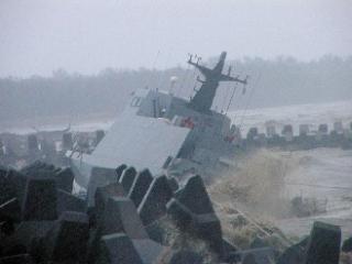 據(jù)報(bào)道,歷經(jīng)薔薇臺(tái)風(fēng)后,擱淺的導(dǎo)彈快艇已被潮水沖上消波塊,船身也因撞擊消波塊而造成許多破洞。由于昨天海上的風(fēng)浪仍大,臺(tái)海軍將等風(fēng)浪變小后再進(jìn)行拖吊作業(yè),如果拖吊不順利,不排除全部拆解后,運(yùn)回左營(yíng)軍港重新組裝。