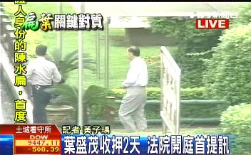 另據(jù)臺灣TVBS電視臺報道,在收押兩天后,葉盛茂在今天上午8時26分,戴著手銬,坐上囚車,首度步出看守所,被借提到臺北地方法院。不過葉盛茂在步出看守所時,刻意用左手擋住右手,避免手銬被拍到。葉盛茂于9時05分許抵達(dá)法院。
