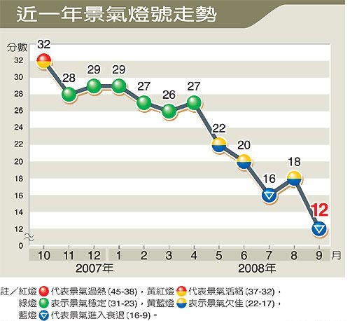 臺經濟建設部門的景氣燈號分數由9分起跳,9月分數跌到12分,臺經濟建設部門官員不諱言,觀察目前狀況,下個月分數恐將繼續(xù)下探。