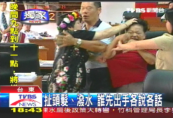 中國臺灣網10月29日消息 據臺灣媒體報道,臺灣臺東市今天召開市民代表大會,一名女代表余梅香發(fā)言不滿市公所的人事任用,遭到另一名女代表賴秀星抗議。2人開始只是言語挑釁,最后不但互扯頭發(fā),還叫罵潑水,旁人頻頻勸阻,但是無法阻止2人沖突。