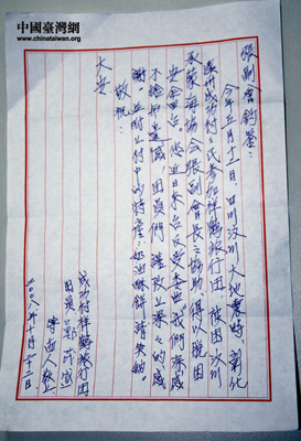 曾于今年五月被困四川汶川地震災(zāi)區(qū)的臺(tái)灣彰化縣鄉(xiāng)親發(fā)給張銘清的慰問信。信中說:四川汶川大地震時(shí),彰化溪州成功村村民參加祥鶴旅行團(tuán),被困汶川,承蒙海協(xié)會(huì)張副會(huì)長(zhǎng)之協(xié)助,得以脫困,安全回臺(tái)。您近日來臺(tái)反受委屈。我們深感不舍與遺憾……(詳全文)(來源:中國(guó)臺(tái)灣網(wǎng) 田云鵬攝)