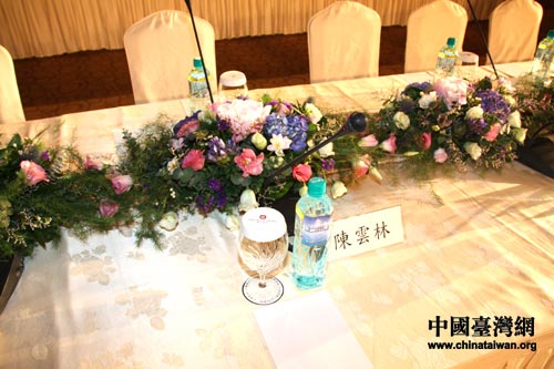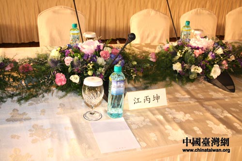 二次“陳江會(huì)”即將于4日上午9點(diǎn)開始,現(xiàn)場(chǎng)一切就緒。圖為江丙坤的坐席。中國(guó)臺(tái)灣網(wǎng) 田云鵬攝