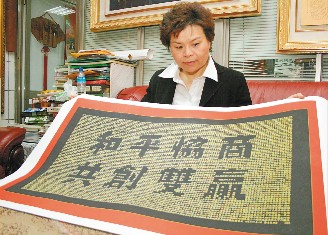 據(jù)指出,這些由書法家詹秀蓉創(chuàng)作的大字,其實(shí)是反白的鏤空書法,大字的四周寫滿了將近6千個(gè)小金字,每個(gè)字1立方厘米大小。密密麻麻的小字鏤出的空白正是“和平協(xié)商,共創(chuàng)雙贏”8個(gè)大字,6千個(gè)小金字的內(nèi)容則是“陳江會談”完成的“海峽兩岸包機(jī)會談紀(jì)要”與“海峽兩岸關(guān)于大陸居民赴臺灣旅游協(xié)議”兩份文件。