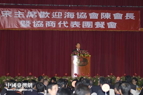 親民黨主席宋楚瑜5日設(shè)午宴歡迎海協(xié)會會長陳云林及海協(xié)會協(xié)商代表團(tuán)一行。這是宋楚瑜在宴會開始前上臺致辭。中國臺灣網(wǎng) 田云鵬攝