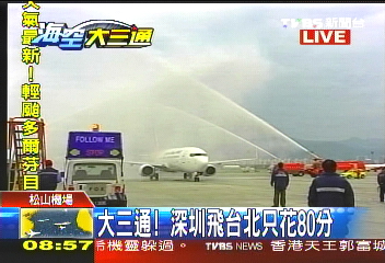 中國(guó)臺(tái)灣網(wǎng)12月15日消息 據(jù)臺(tái)灣TVBS電視臺(tái)報(bào)道,深圳航空Z(yǔ)H9095航班今早8時(shí)40分提前飛抵臺(tái)北松山機(jī)場(chǎng),這架從深圳起飛的航班成為兩岸直接“三通”首個(gè)抵達(dá)臺(tái)灣的大陸航班。