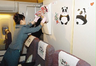 報道稱,為迎接“團(tuán)團(tuán)”、“圓圓”兩位貴客,熊貓專機(jī)設(shè)計的也是相當(dāng)特別。走進(jìn)機(jī)艙,映入眼簾的就是一幅大大的熊貓壁畫,飛機(jī)上還有許多可愛的熊貓插圖,就連乘客座位的椅套,也畫著相親相愛的“團(tuán)團(tuán)”、“圓圓”。