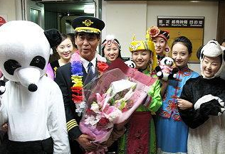 川航總裁藍(lán)新國(guó)表示,“原本預(yù)計(jì)飛行3個(gè)半小時(shí)的時(shí)間,卻縮短僅不到3個(gè)小時(shí)的時(shí)間就抵達(dá),當(dāng)飛機(jī)穿過(guò)云層看到臺(tái)灣陸地時(shí),心情感覺(jué)特別激動(dòng),而且為了慶祝川航首度加入直航,特別將一架飛機(jī)彩繪,機(jī)身前端印有‘美在四川情系兩岸’8個(gè)大字,另外還有‘四川人民感謝臺(tái)灣同胞,在5.12地震期間為我們所提供的無(wú)私援助’,而在發(fā)動(dòng)機(jī)上則噴有代表四川的芙蓉花。”