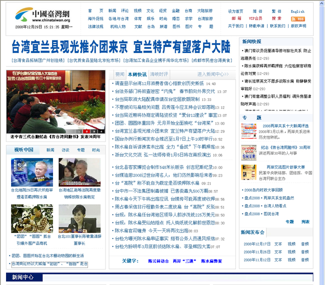 中國(guó)臺(tái)灣網(wǎng)12月29日消息 為適應(yīng)兩岸交流大勢(shì),中國(guó)臺(tái)灣網(wǎng)于2008年12月29日下午推出全新首頁(yè)。