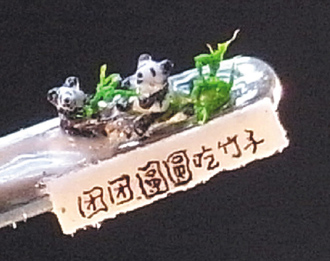 據(jù)臺媒報道,從事微雕已經(jīng)29年的臺灣微雕家陳逢顯,繼上月用樹脂創(chuàng)作出世界最小的大熊貓后,又花費20個工作日以頭發(fā)創(chuàng)作出世界最小的大熊貓,作品取名“團團圓圓吃竹子”。作品中“團團”“圓圓”表情快樂的吃著臺灣產(chǎn)的竹子,栩栩如生,令人嘆為觀止。陳逢顯表示,這個作品象征臺灣土產(chǎn)的竹子也能讓“團團”“圓圓”享用后,身體健康又聰明可愛,和臺灣民眾打成一片。