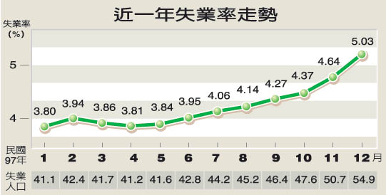 報(bào)道稱,去年12月失業(yè)率創(chuàng)新高,其中,有多達(dá)25萬名的失業(yè)人口,因關(guān)廠歇業(yè)丟工作,幾乎回到上一波經(jīng)濟(jì)衰退(2002年)期間的水準(zhǔn),景氣的快速衰退,是導(dǎo)致勞動力市場每況愈下的主要原因。