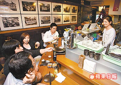 謝長廷子弟兵在臺北市新生北路開了間日式燒烤店,墻上掛滿海報及攝影作品,不少綠營人士常前往相互取暖。(臺灣《蘋果日報》圖片)