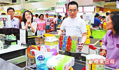 陳水扁之子陳致中(右二)在結(jié)帳時(shí),黃睿靚雙手抱拳拜托媒體不要把他們購(gòu)買的物品全部拍出來(lái)。來(lái)源:臺(tái)灣《蘋(píng)果日?qǐng)?bào)》