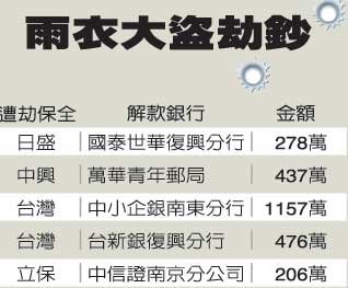 專案小組比對去年臺灣萬華青年郵局、臺灣中小企銀南東分行、臺新復興分行及2002年中信證券公司等四件運鈔保安遭槍擊劫鈔案,發(fā)現(xiàn)歹徒都是利用下雨天、穿雨衣作掩護,戴安全帽遮住容貌,逼近保安就開槍恫嚇行搶。