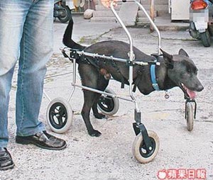 臺北市劉姓婦人得知后,捐出一部市價2萬元新臺幣的美國制狗輪椅,“暴龍”昨由獸醫(yī)師裝上輪椅,重獲行動自由,興奮得四處亂跑。(高大林)