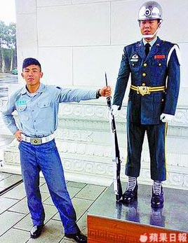 臺(tái)陸軍儀仗隊(duì)成員在臺(tái)北忠烈祠站崗時(shí)比出V字手勢(shì)搞笑。來源:臺(tái)灣《蘋果日?qǐng)?bào)》