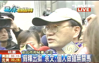 中國(guó)臺(tái)灣網(wǎng)4月6日消息 據(jù)臺(tái)灣TVBS報(bào)道,前臺(tái)北市政府秘書余文,6日上午10時(shí)步出監(jiān)獄。余文在馬英九特別費(fèi)案中,因?yàn)閭卧煳臅慌刑幱衅谕叫?年,從去年的6月13日服刑,已經(jīng)過(guò)了9個(gè)多月,因?yàn)樵讵z中表現(xiàn)良好聲請(qǐng)假釋,臺(tái)灣法務(wù)主管部門日前核準(zhǔn)。