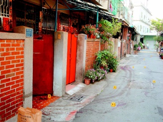 臺灣海軍士兵曾紹慈、梁伯羽殺死越南女子,被害人死前掙扎逃出,倒在屋外二十公尺處,卻被兇嫌拖回去繼續(xù)砍,地上留有長長血痕,警方沿著血痕擺放搜證的號碼牌。(圖片來源:臺灣《聯(lián)合報》)