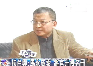 中國(guó)臺(tái)灣網(wǎng)4月20日消息 據(jù)臺(tái)灣TVBS電視臺(tái)報(bào)道,曾經(jīng)指控前陳水扁辦公室副秘書(shū)長(zhǎng)陳哲男涉嫌賣(mài)官的臺(tái)軍前少將扶臺(tái)興,昨天晚間再度驚爆,前陳水扁辦公室主任馬永成也曾出面要過(guò)臺(tái)軍“將官升遷呈報(bào)名冊(cè)”,扶臺(tái)興還強(qiáng)調(diào),以馬永成的職位,根本不該來(lái)關(guān)心這件事;臺(tái)“立委”邱毅則是直接挑明,要名單當(dāng)然就是為了買(mǎi)官和賣(mài)官。