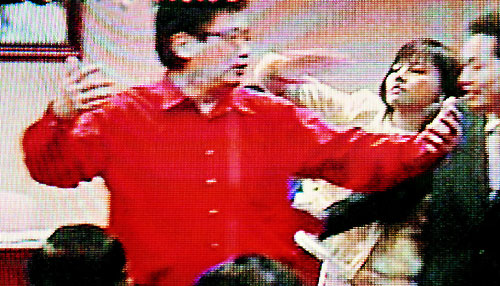 民進(jìn)黨“立委”邱議瑩(中)上午不滿國民黨“立委”李慶華(左)發(fā)言時(shí)說她“沒家教”、“潑婦”,上前甩了李慶華一巴掌,并在散會后上前追打。來源:臺灣聯(lián)合晚報(bào)