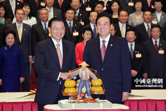 陳云林向江丙坤贈(zèng)送一幅云錦。26日下午,在成功簽署《海峽兩岸空運(yùn)補(bǔ)充協(xié)議》、《海峽兩岸金融合作協(xié)議》、《海峽兩岸共同打擊犯罪及司法互助協(xié)議》等三項(xiàng)協(xié)議后,陳云林與江丙坤互贈(zèng)紀(jì)念品。(中國臺(tái)灣網(wǎng) 鐘寶華 攝)
