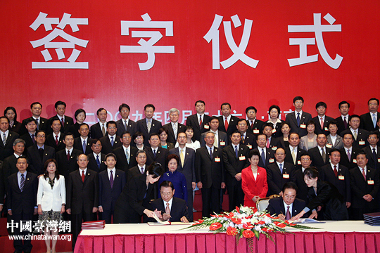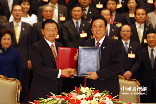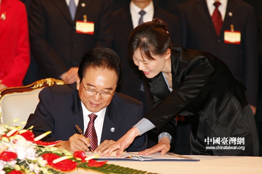 ;鶗麻L江丙坤簽署協(xié)議。26日下午三時許,海協(xié)會會長陳云林與臺灣海基會董事長江丙坤在南京紫金山莊正式簽署《海峽兩岸空運補充協(xié)議》、《海峽兩岸金融合作協(xié)議》、《海峽兩岸共同打擊犯罪及司法互助協(xié)議》。(中國臺灣網(wǎng) 鐘寶華 攝)