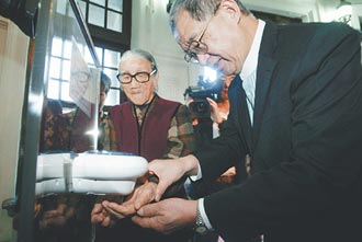 臺(tái)“監(jiān)察院”昨天舉辦“媽媽我愛(ài)您”敬親活動(dòng),“監(jiān)察院長(zhǎng)”王建煊(右)帶著母親(左)出席,一進(jìn)“監(jiān)察院”,立刻使用預(yù)防新流感的消毒機(jī)為母親洗手。來(lái)源:臺(tái)灣《聯(lián)合報(bào)》