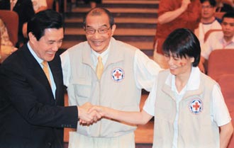 馬英九(左)、周美青(右)伉儷昨天在臺(tái)中市出席臺(tái)灣紅十字組織活動(dòng),馬英九致詞稱(chēng)妻子“周會(huì)長(zhǎng)”時(shí),不僅自己笑場(chǎng),全場(chǎng)都哈哈大笑。在臺(tái)灣紅十字組織負(fù)責(zé)人陳長(zhǎng)文刻意拉攏下,馬英九向“周榮譽(yù)會(huì)長(zhǎng)”握手致意,顯得有點(diǎn)尷尬。來(lái)源:臺(tái)灣《聯(lián)合報(bào)》