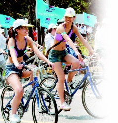2009年“臺(tái)灣自行車日”活動(dòng)昨天上午舉行,車友們花盡心思呈現(xiàn)出最獨(dú)特的造型,包括穿著清涼的辣妹兵團(tuán)。圖片來(lái)源:臺(tái)灣《聯(lián)合晚報(bào)》