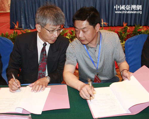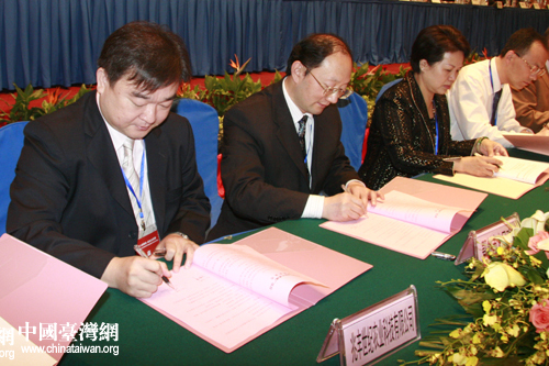 鄂臺(tái)兩地工商、企業(yè)等團(tuán)體代表現(xiàn)場(chǎng)進(jìn)行了合作新項(xiàng)目的簽約儀式。(中國(guó)臺(tái)灣網(wǎng) 高斯斯 攝)
